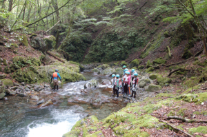 - 翌日は現地「多摩川源流研究所」のスタッフに先導していただき、源流体験に出かけます。源流体験は源流の沢に沿って歩きます。水に濡れますし、すべりやすく転ぶ恐れもありますので、服装は、長そで・長ズボン(ジャージもしくは濡れてもいいもの)、くつは、上履き(マリンシューズ)の上にくつ下を履いて滑り止めとします。従って、捨てても良いくつ下を、必ず用意してください。ヘルメット・ライフジャケットは源流研究所にて準備しています。